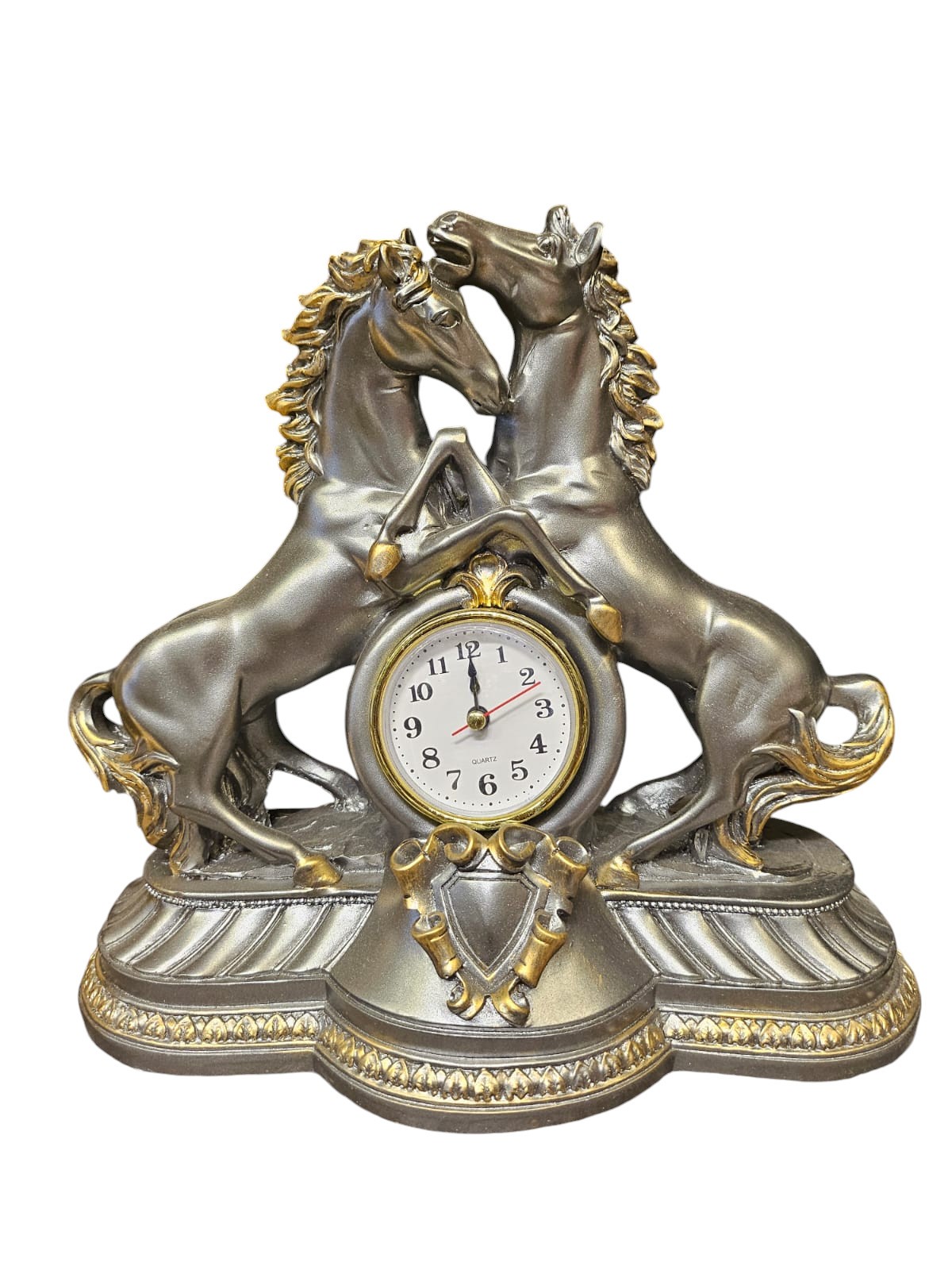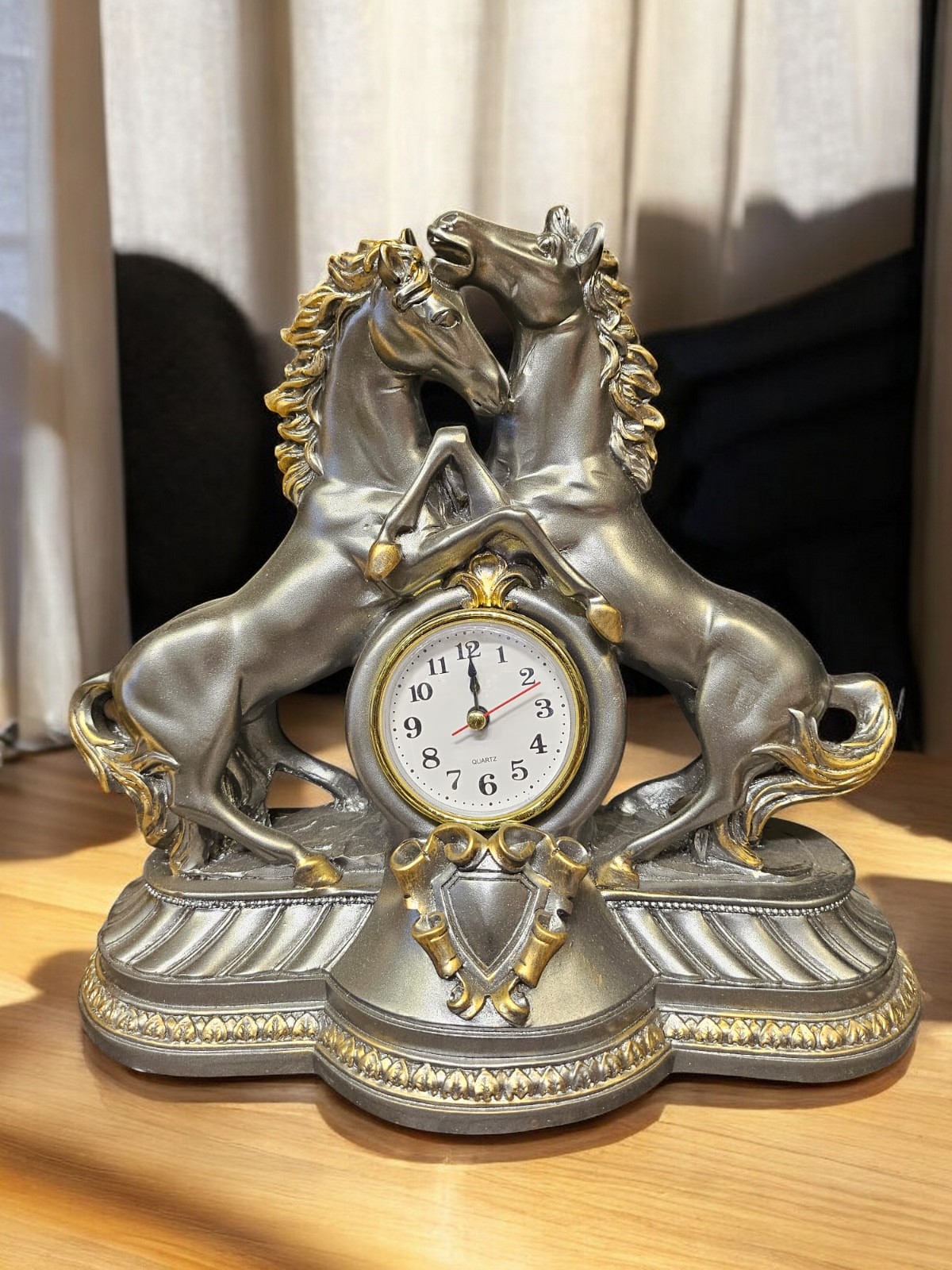 •    Tasarım: İki yanda at figürleriyle dekoratif masa saati