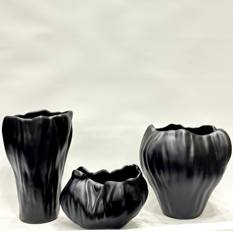 Farklı ölçülerde 3 adet dekoratif vazodan oluşan modern tasarımlı bir settir.